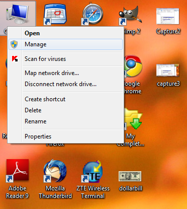 1. Right click on the “My Computer” icon on your desktop and select “manage” from the menu. That will open a new window.