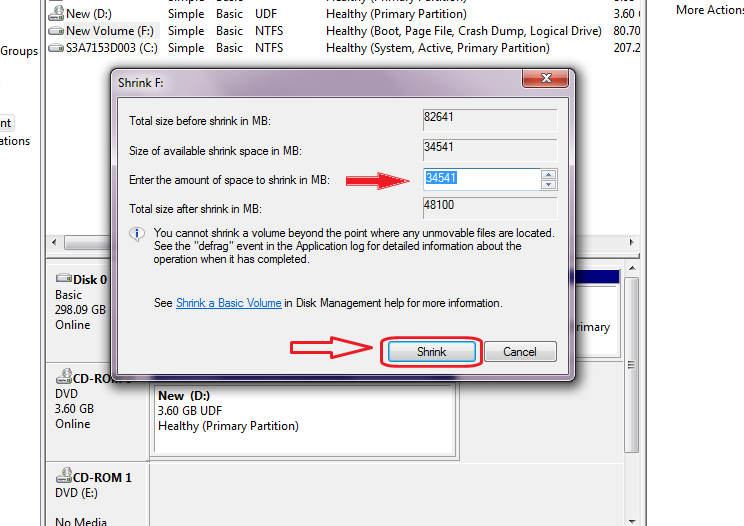 4. After some calculations a small window will appear. Enter the size of the new volume and click “Shrink”.